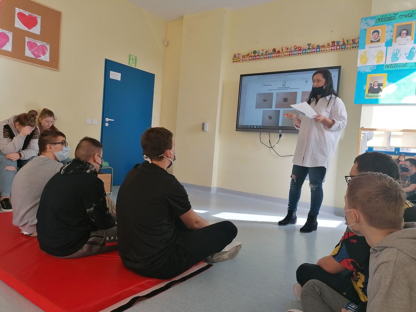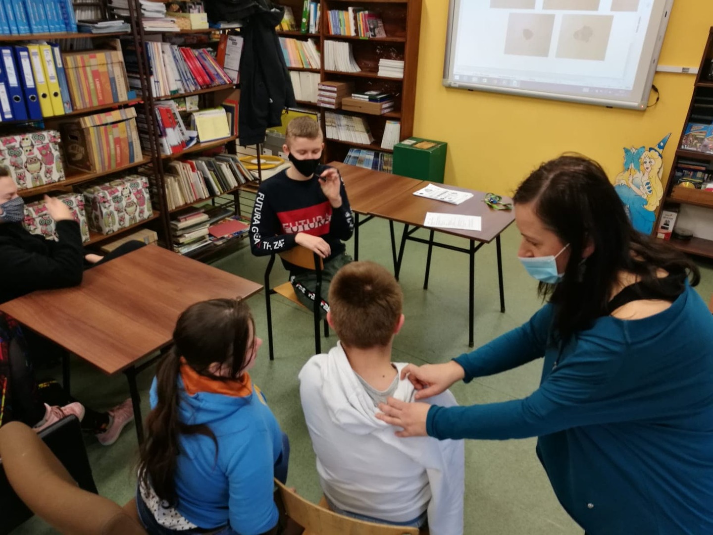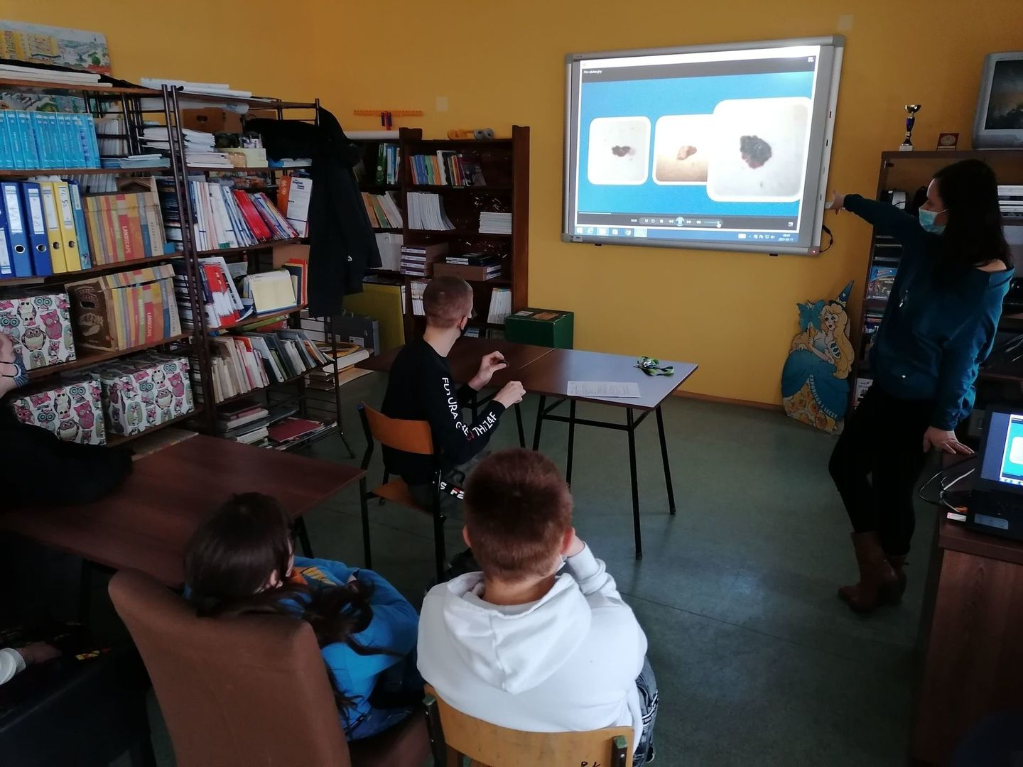 W ramach udziału w powyższym programie, w okresie od stycznia do marca 2021r., zostały przeprowadzone zajęcia lekcyjne w klasach 7a i 8a. Uczniowie podczas prelekcji prowadzonych przez panią A. Drzewiecką oraz panią M. Juszczyk zapoznali się z podstawowymi zagadnieniami dotyczącymi chorób skóry tzw. „ABCDE czerniaka”. Dzieci nauczyły się, jak przeprowadzić samobadanie skóry i rozróżnić zmianę nowotworową od zwykłego znamiona. Zapoznały się także z ilustracjami obrazującymi zmiany skórne, obejrzały film edukacyjny „Znamię! Znam je?”. Młodzież aktywnie i z zaangażowaniem uczestniczyła w zajęciach.