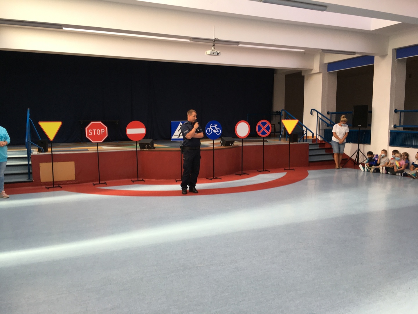 Niedawno rozpoczęliśmy nowy rok szkolny. Powróciliśmy do naszych obowiązków, nowych wyzwań i przyjaciół. Pamiętając o bezpieczeństwie, uczymy się i bawimy. W czwartek 9.09 spotkaliśmy się na szkolnej auli. Na zaproszenie Zespołu Bezpiecznej Szkoły przybył do naszej szkoły pan policjant - młodszy aspirant - Paweł Głębocki.