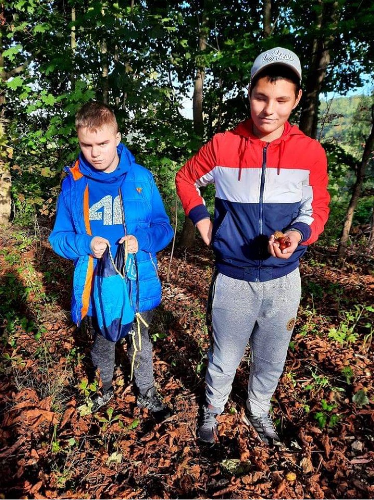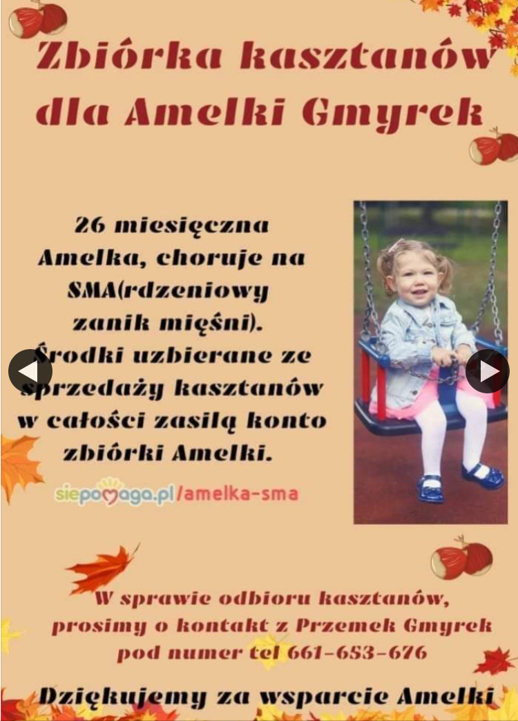 W poniedziałek 4 października uczniowie klasy 6Z wraz z panią M. Błaszczyk i B. Radwańską-Zieleń wybrali się na poszukiwanie kasztanów. Zbiory były owocne, a kosze zapełnione. Klasa wzięła udział w szczytnej akcji - kasztany zbierane są bowiem dla chorej na (SMA) rdzeniowy zanik mięśni małej Amelki z okolicznego Strzegomia. Dochód ze sprzedaży kasztanów zasili konto dziewczynki. Zachęcamy inne klasy, aby włączyły się do akcji!
