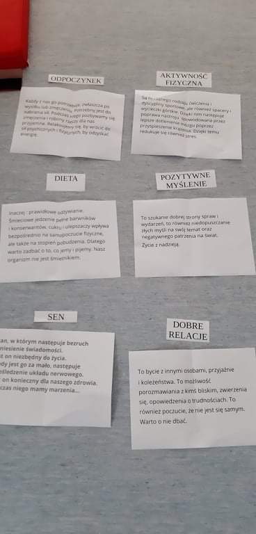Dnia 10 października obchodzimy Światowy Dzień Zdrowia Psychicznego. Z tej okazji uczniowie klasy 8 A wzięli udział w warsztatach zorganizowanych przez szkolny Zespół Promocji Zdrowia. Tematem zajęć było przybliżenie uczniom, czym jest zdrowie psychiczne oraz w jaki sposób możemy o nie zadbać. Uczniowie aktywnie wzięli udział w zajeciach i prowadzonej dyskusji. Poznali również i doświadczyli relaksacji, jako sposobu na obniżenie poziomu stresu. Warsztaty z młodzieżą przeprowadziła Alina Świderska, relaksację przygotowała Anna Kujat.