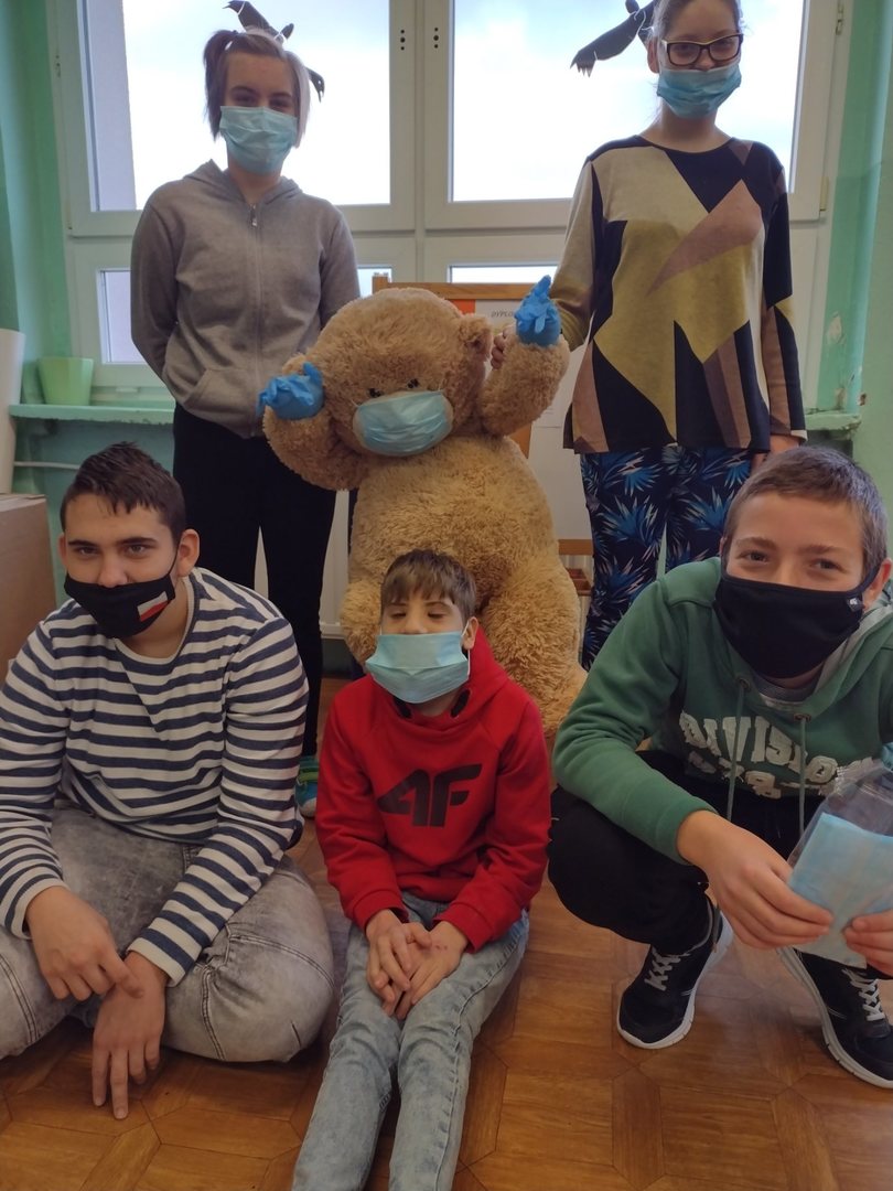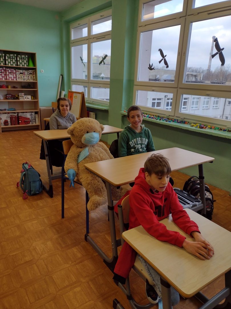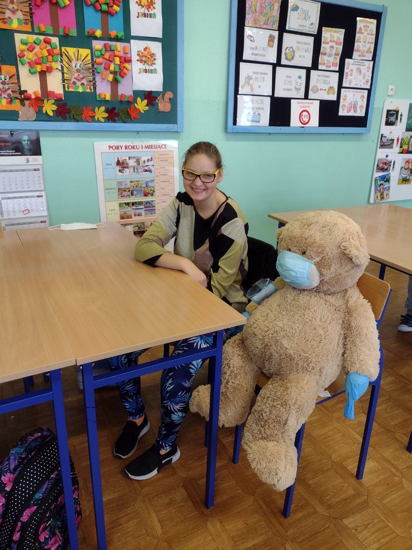 W Światowym Dniu Pluszowego Misia (25 XI) naszą szkołę odwiedził nietypowy gość - Miś Pandemiś. Przypomniał on o sposobach ochrony przed chorobą COVID- 19. Podczas przerw rozdawał maseczki i zachęcał do ich noszenia.