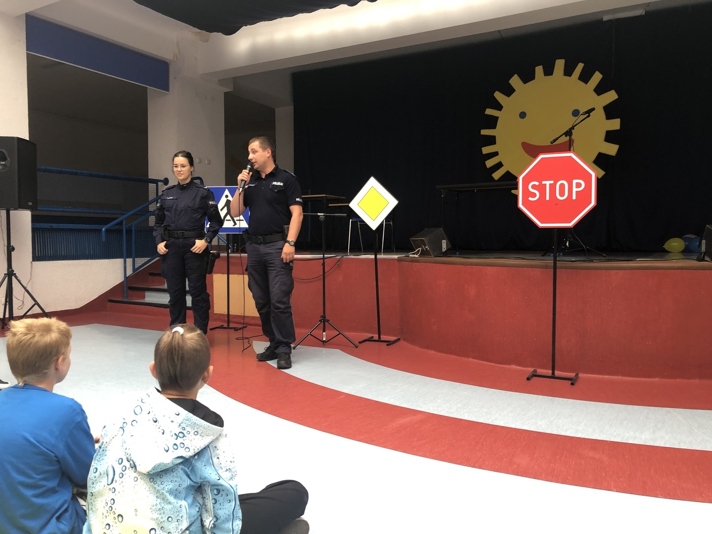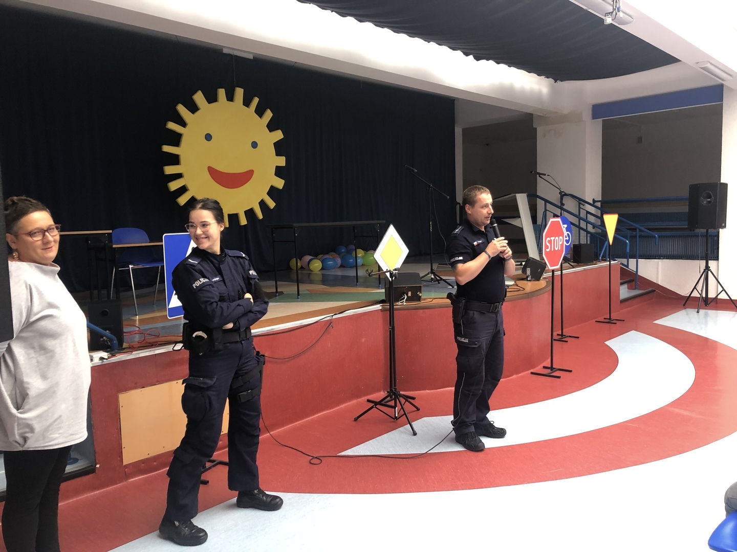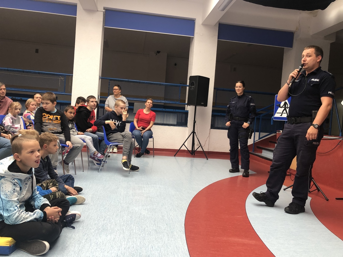 Niedawno rozpoczęliśmy nowy rok szkolny. Powróciliśmy do naszych obowiązków, nowych wyzwań i przyjaciół. Pamiętając o bezpieczeństwie, uczymy się i bawimy. W czwartek 21.09 spotkaliśmy się na szkolnej auli. Na zaproszenie Zespołu Bezpiecznej Szkoły przybył do naszej szkoły pan policjant - młodszy aspirant - Paweł Głębocki oraz sierżant Patrycja Stefek.
