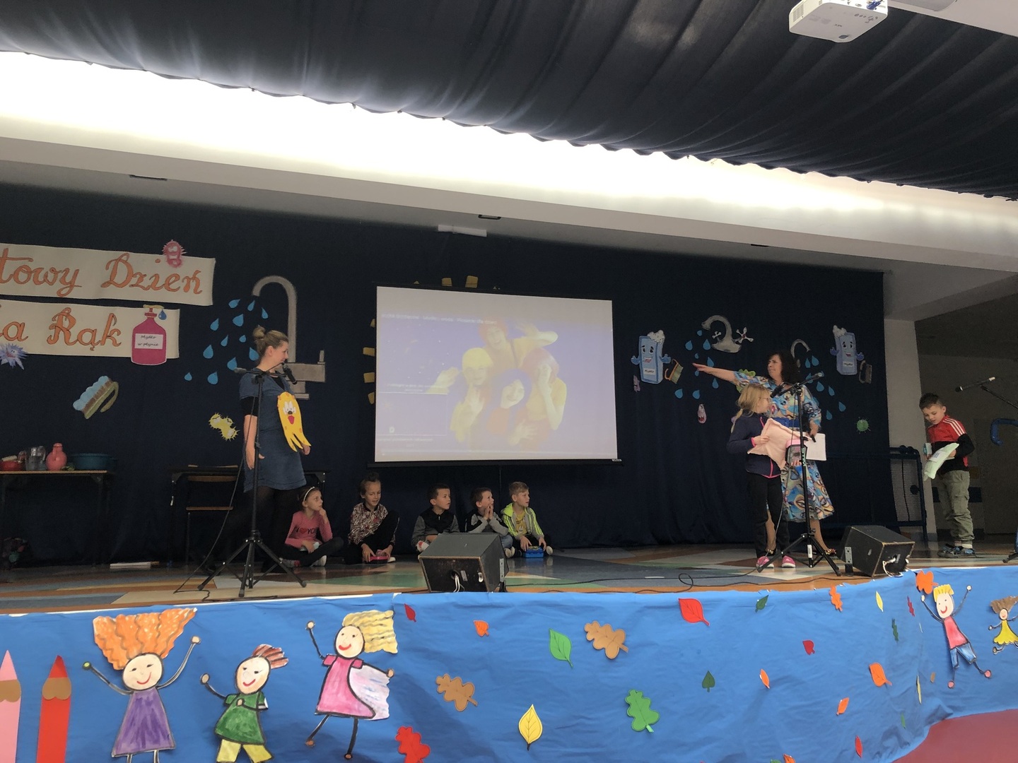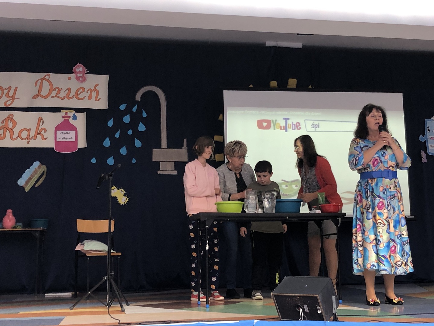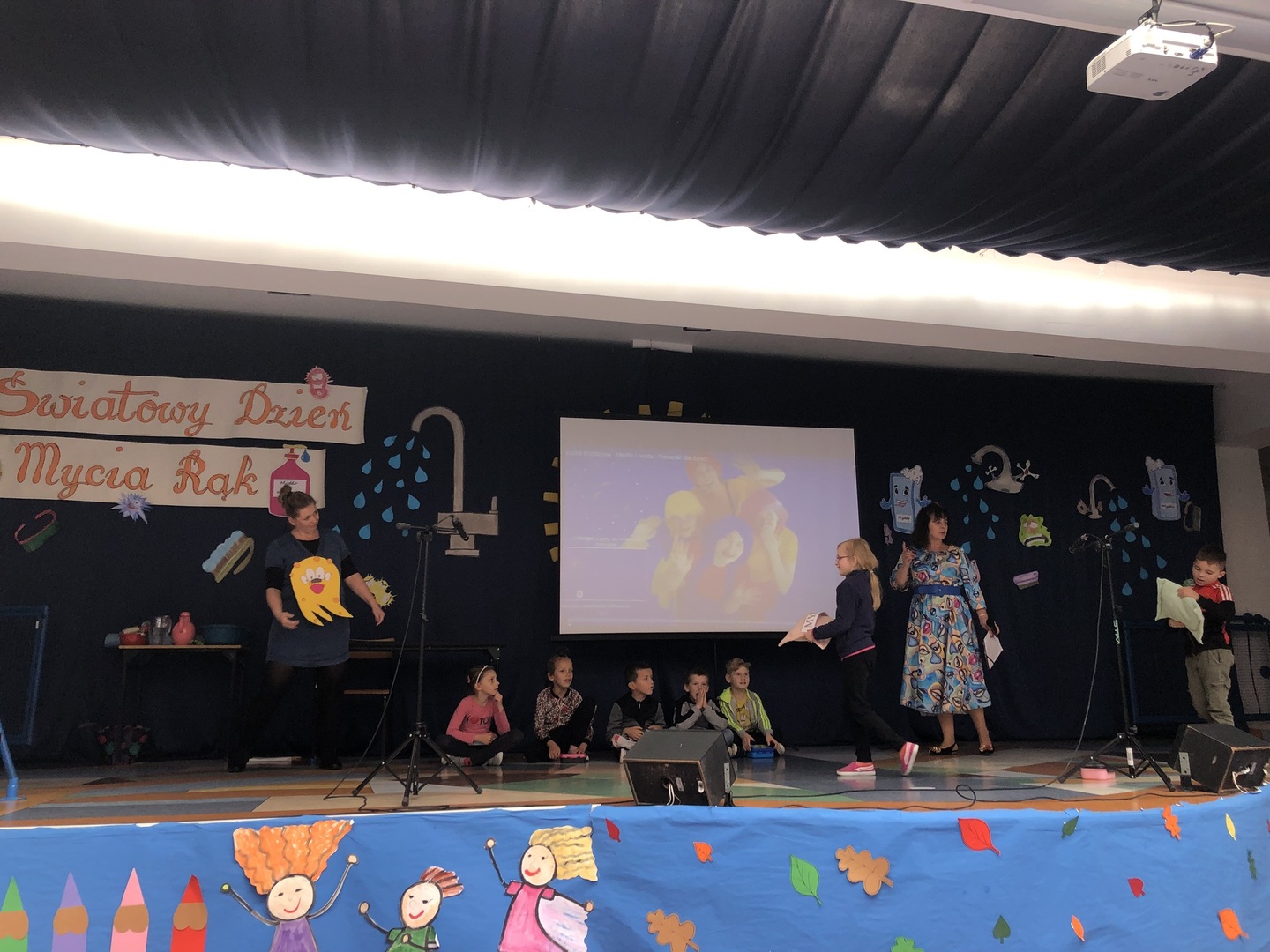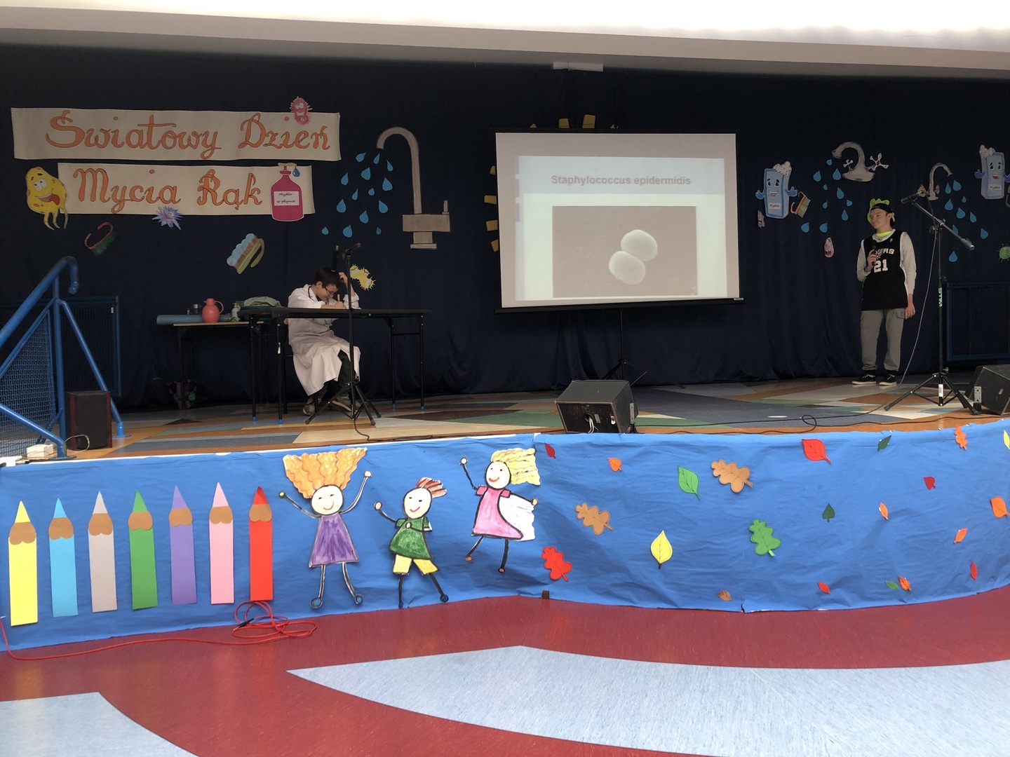 Uczniowie klasy 5B i 8C ( Wiktor oraz Mariusz) zaprezentowali scenkę epizodyczną o charakterze prozdrowotnym pt. „Wizyta u lekarza”. Poprzez humorystyczne podejście ukazali znaczenie dbałości o czystość rąk w życiu codziennym. Następnie przeprowadzono „burzę mózgów”, w trakcie której dzieci miały okazję odpowiedzieć na pytania dotyczące higieny i zdrowia. Prowadzące przygotowały również prezentację multimedialną na temat mikrobów, które znajdują się na naszych dłoniach. Z kolei eksperyment, pokazujący różnice w myciu rąk w ciepłej i zimnej wodzie, dostarczył wielu cennych wniosków. Podczas kolejnej prezentacji pokazano, jak prawidłowo myć ręce, co było idealnym wprowadzeniem do ćwiczeń praktycznych. Uczniowie mieli okazję przećwiczyć mycie rąk na sucho, ucząc się odpowiedniej techniki. Momentem artystycznym spotkania był wiersz „Czyścioch” w wykonaniu zdolnego ucznia klasy 8C, Mariusza Graby. Wprowadził on wszystkich w pozytywny nastrój, który utrzymywał się podczas przedstawienia w wykonaniu młodszych uczniów klasy 1A pod kierunkiem p. B. Brojanowskiej. Następnie cała społeczność szkolna miała okazję aktywnie zaangażować się w zabawę ruchowo-muzyczną przy rytmach piosenki „Mydło i woda”. Wspólne śpiewanie i tańce sprawiły, że atmosfera była pełna radości. Jednym z ostatnich punktów programu było układanie tematycznych haseł z rozsypanki wyrazowej, co było świetnym ćwiczeniem dla mózgu.