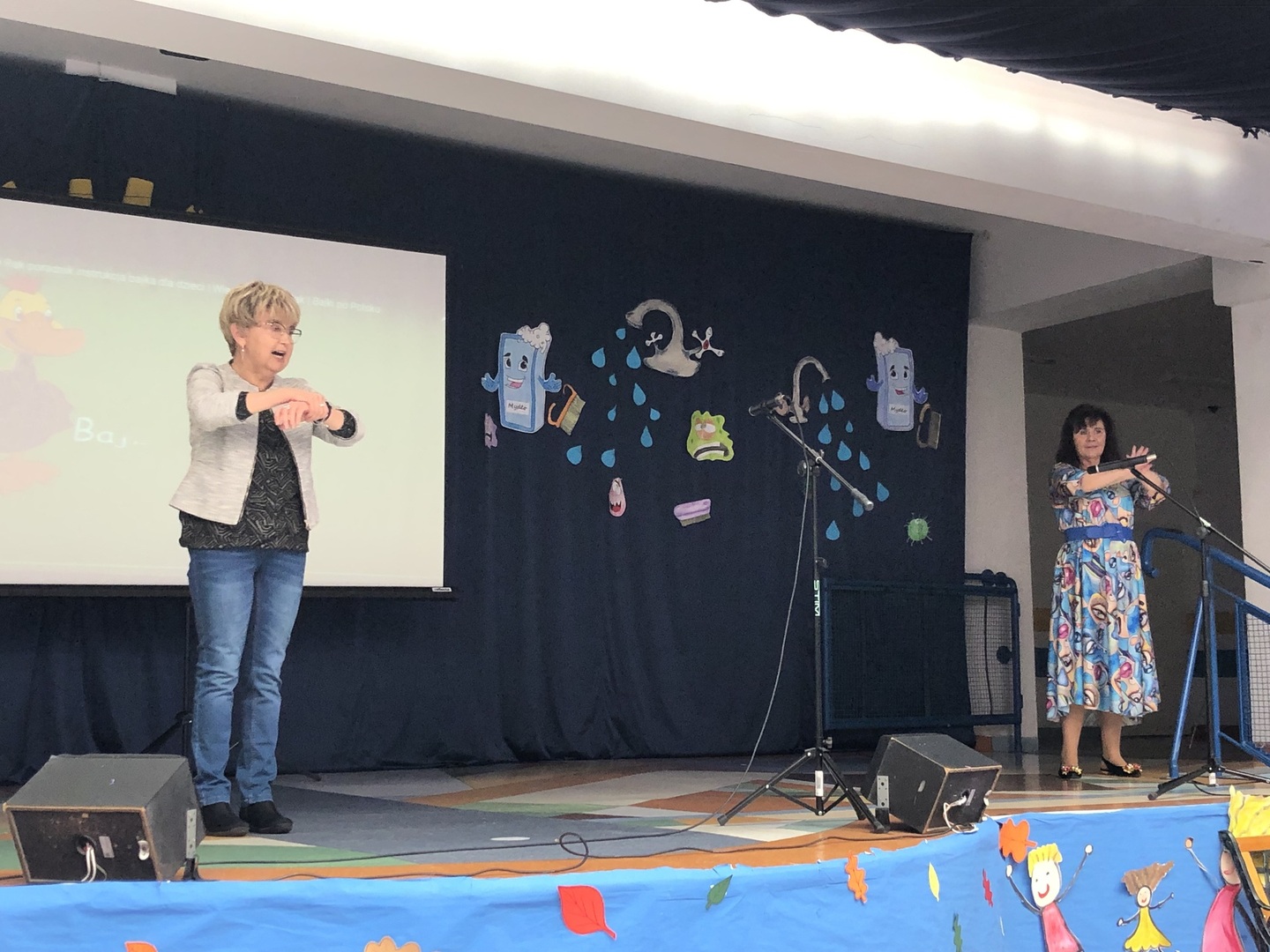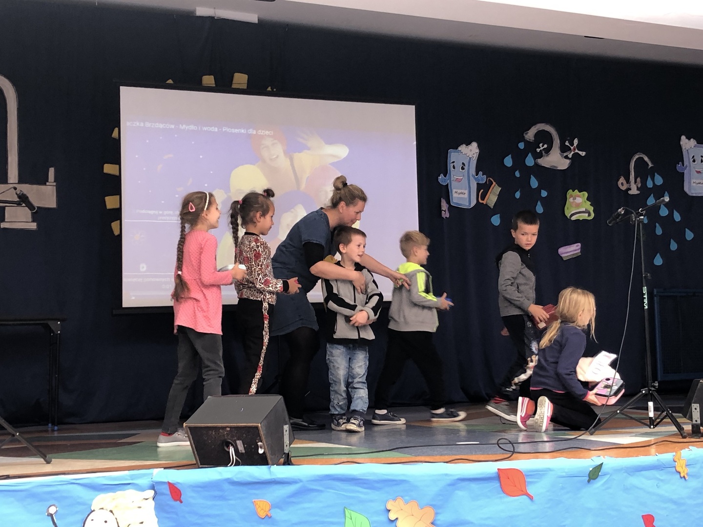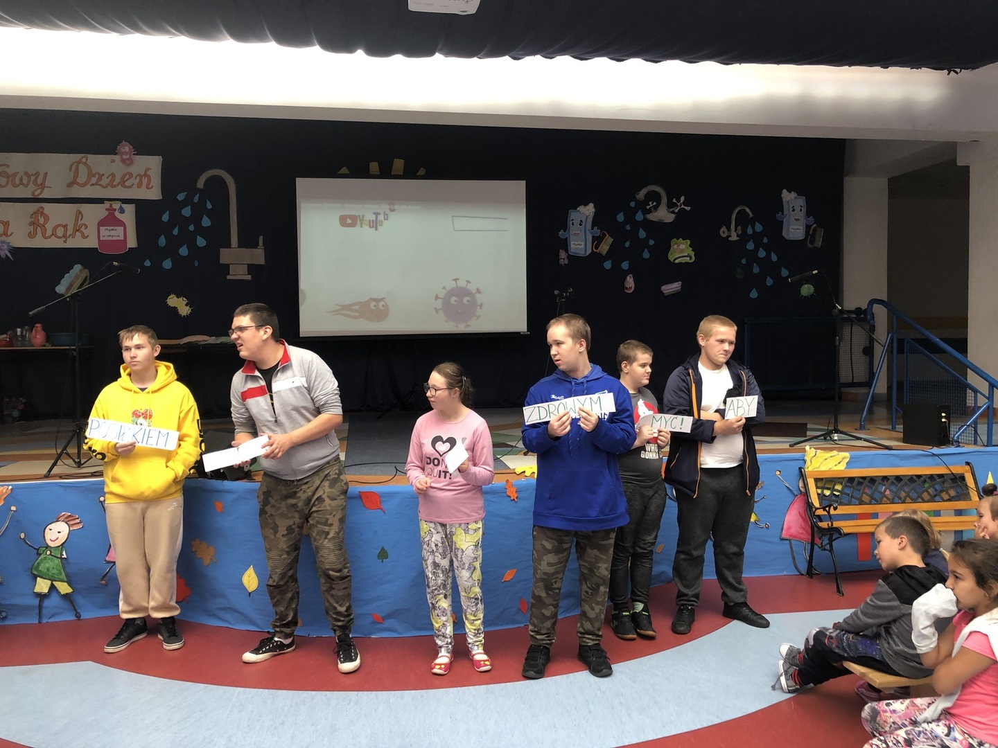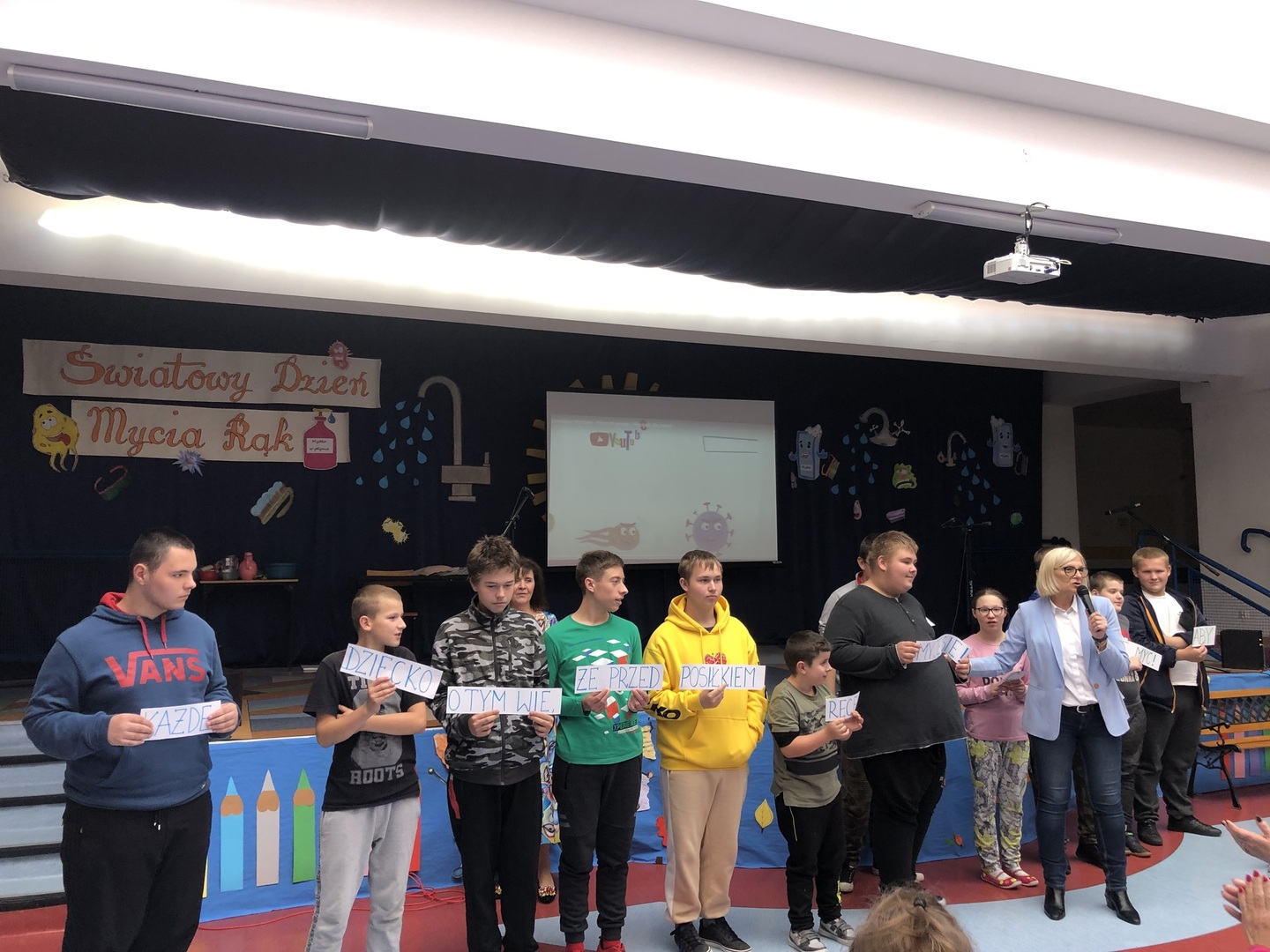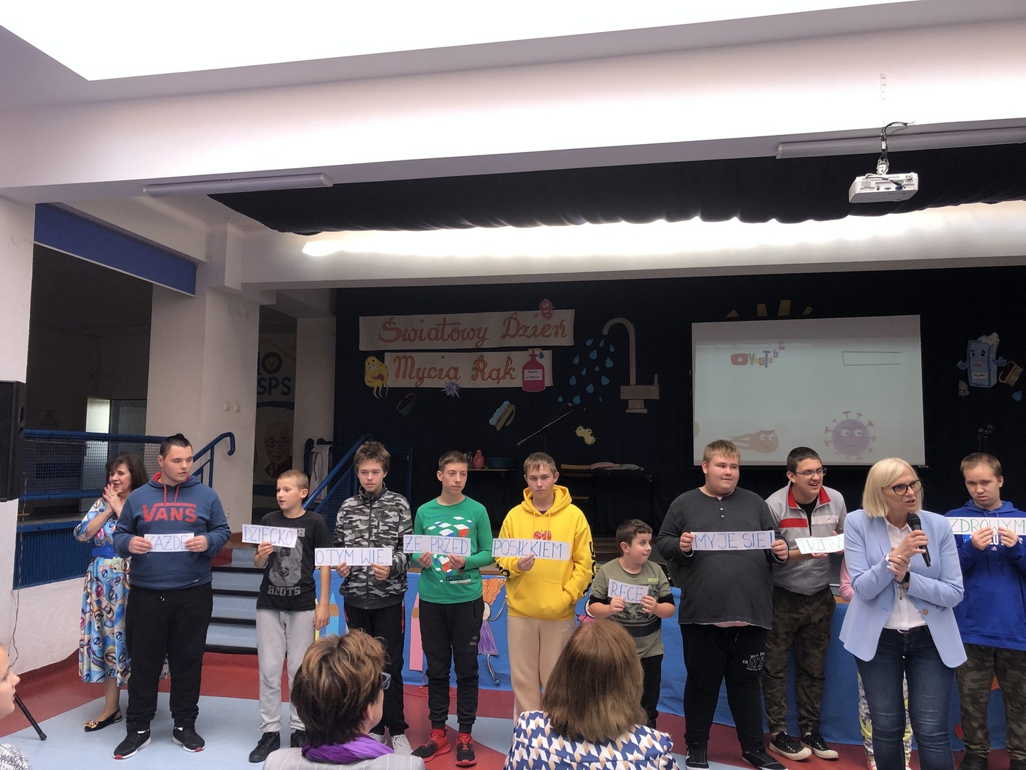 Uczniowie klasy 5B i 8C ( Wiktor oraz Mariusz) zaprezentowali scenkę epizodyczną o charakterze prozdrowotnym pt. „Wizyta u lekarza”. Poprzez humorystyczne podejście ukazali znaczenie dbałości o czystość rąk w życiu codziennym. Następnie przeprowadzono „burzę mózgów”, w trakcie której dzieci miały okazję odpowiedzieć na pytania dotyczące higieny i zdrowia. Prowadzące przygotowały również prezentację multimedialną na temat mikrobów, które znajdują się na naszych dłoniach. Z kolei eksperyment, pokazujący różnice w myciu rąk w ciepłej i zimnej wodzie, dostarczył wielu cennych wniosków. Podczas kolejnej prezentacji pokazano, jak prawidłowo myć ręce, co było idealnym wprowadzeniem do ćwiczeń praktycznych. Uczniowie mieli okazję przećwiczyć mycie rąk na sucho, ucząc się odpowiedniej techniki. Momentem artystycznym spotkania był wiersz „Czyścioch” w wykonaniu zdolnego ucznia klasy 8C, Mariusza Graby. Wprowadził on wszystkich w pozytywny nastrój, który utrzymywał się podczas przedstawienia w wykonaniu młodszych uczniów klasy 1A pod kierunkiem p. B. Brojanowskiej. Następnie cała społeczność szkolna miała okazję aktywnie zaangażować się w zabawę ruchowo-muzyczną przy rytmach piosenki „Mydło i woda”. Wspólne śpiewanie i tańce sprawiły, że atmosfera była pełna radości. Jednym z ostatnich punktów programu było układanie tematycznych haseł z rozsypanki wyrazowej, co było świetnym ćwiczeniem dla mózgu.