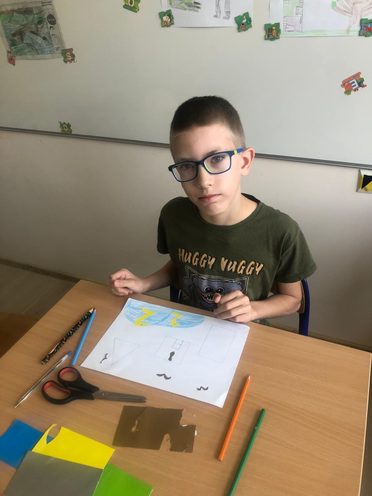 Uczniowie klasy 1b wykonywali pomysłowe prace plastyczne wykorzystując kolorowe płaskie figury geometryczne.
