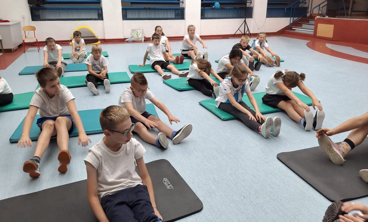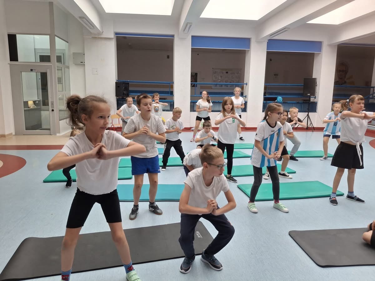 - oficjalne rozpoczęcie, rozgrzewka, wesoły taniec: „Ćwiczymy, ćwiczymy”